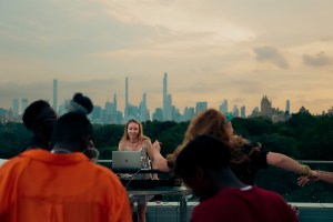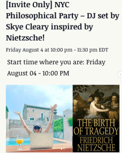An Australian based in New York City with a PhD in existential philosophy, Skye (also known as Existential DJ) spins cocktail house, glitter house, and electropop vibes. She designs playful philosonic journeys to free the chaos within. She DJs at literary festivals, beach parties, cocktail bars, dance clubs, rooftop parties, kids’ parties, and on cruises. She also teaches DJing.